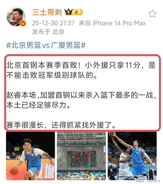值得關注的是,北京隊惜敗廣廈,4位媒體人,同時指出北京隊一軟肋,而這個軟肋,正是當晚14中4的小外援杰曼。賽后,媒體人三土帶刺發(fā)文表示:“北京首鋼本賽季首敗!小外援只拿11分,是不能擊敗冠軍級別球隊的。本場,加盟首鋼以來殺入籃下最多的一戰(zhàn),本土已經足夠盡力。賽季很漫長,還得抓緊找外援了?!薄?/p>