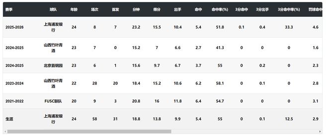 除了21-22賽季是大學(xué)生聯(lián)隊(duì)之外,劉禹彤實(shí)際上是2023-24賽季才開始征戰(zhàn)WCBA,上賽季她在山西、北京場(chǎng)均都只有15分鐘,本賽季劉禹彤終于獲得了穩(wěn)定的登場(chǎng)時(shí)間,這也是她生涯新高的場(chǎng)均得分時(shí)間。