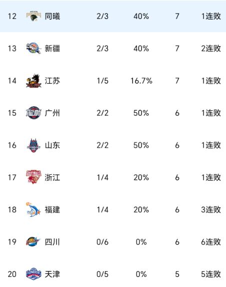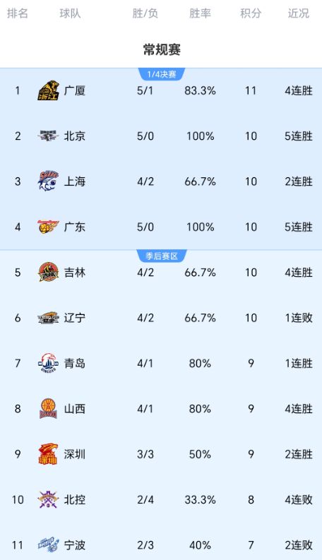 前五輪過(guò)后,只有北京隊(duì)、廣東隊(duì)開(kāi)局五連勝,青島隊(duì)、遼寧隊(duì)、廣廈隊(duì)、山西隊(duì)都是4勝1負(fù)戰(zhàn)績(jī),另外天津隊(duì)、四川隊(duì)繼續(xù)全敗,未能收獲一場(chǎng)勝利。