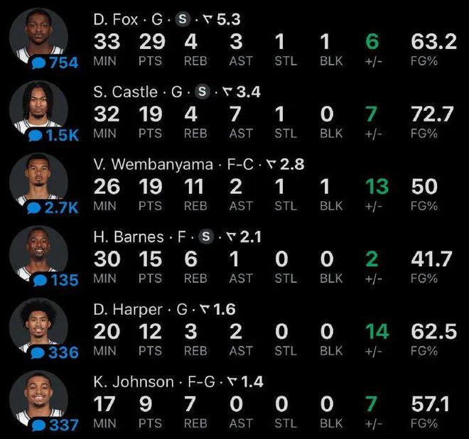 馬刺??怂?、卡斯?fàn)?、哈珀三后衛(wèi)齊飆,主打一個(gè)分工合作,干活不累,??怂挂粋€(gè)包攬上半場(chǎng),卡斯?fàn)?、哈珀統(tǒng)領(lǐng)下半場(chǎng),用突破把防守天下第一的雷霆突成了突突。