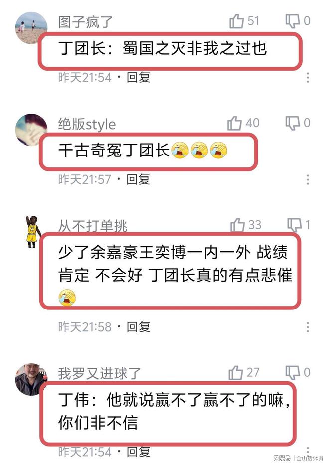 “丁偉:這回誰背鍋啊”;“丁團(tuán)長這場球終于不用背鍋了,背鍋俠”;“丁團(tuán)長起碼能跟寧波打加時輸 現(xiàn)在四節(jié)就輸了”;“之前罵丁團(tuán)長的,能否表示一下?!?;“原來丁團(tuán)長最冤枉”;“沒有丁團(tuán)長,只能更慘”……